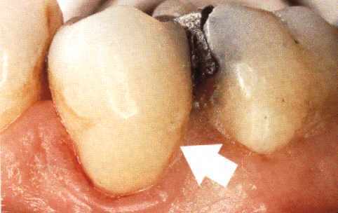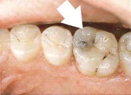 Tandbederf in de kies schemert als een donkere vlek door. |