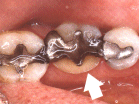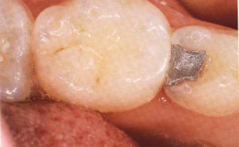 Een amalgaamvulling versterkt de kies niet. Daardoor is aan de tongzijde de knobbel van de kies afgebroken naast de vulling. |