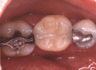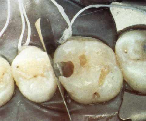 Een rubberdam - ook wel cofferdam genoemd - is met behulp van een klem en draadjes over de kies bevestigd. Het aangetaste materiaal is al uit de kies verwijderd. |
