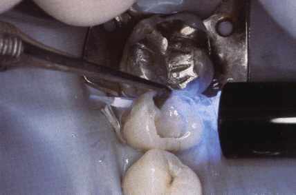 Voorafgaand aan het aanbrengen van een witte vulling wordt de tand of kies eerst met een zuur voorbehandeld. Afhankelijk van het gebruikte materiaal wordt nog een hechtlaag aangebracht. Door belichting wordt deze hechtlaag uitgehard. |
